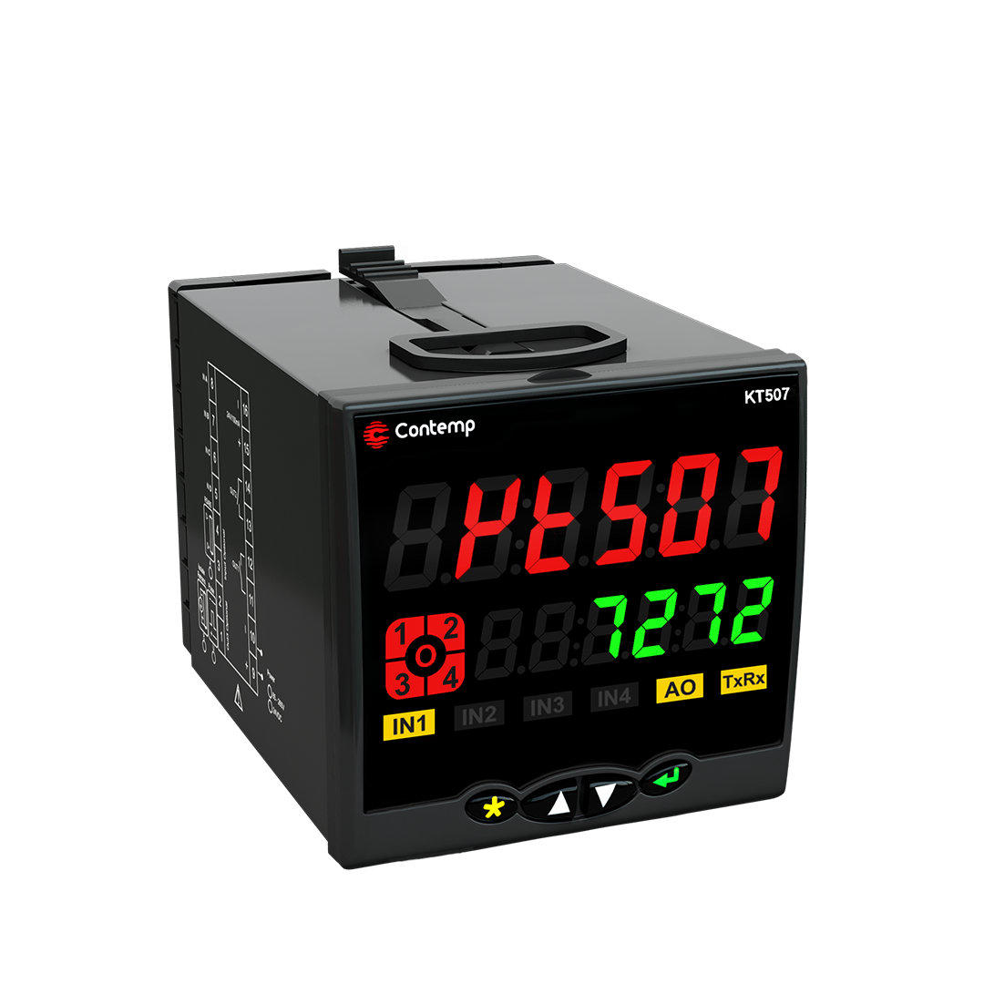 Com grande display de alto brilho, o KT507 une as funcionalidades de temporizador, contador e velocímetro. Possui 4 entradas universais, alimentação para sensores e 2 saídas a relé. Permite a instalação de até 2 opcionais.