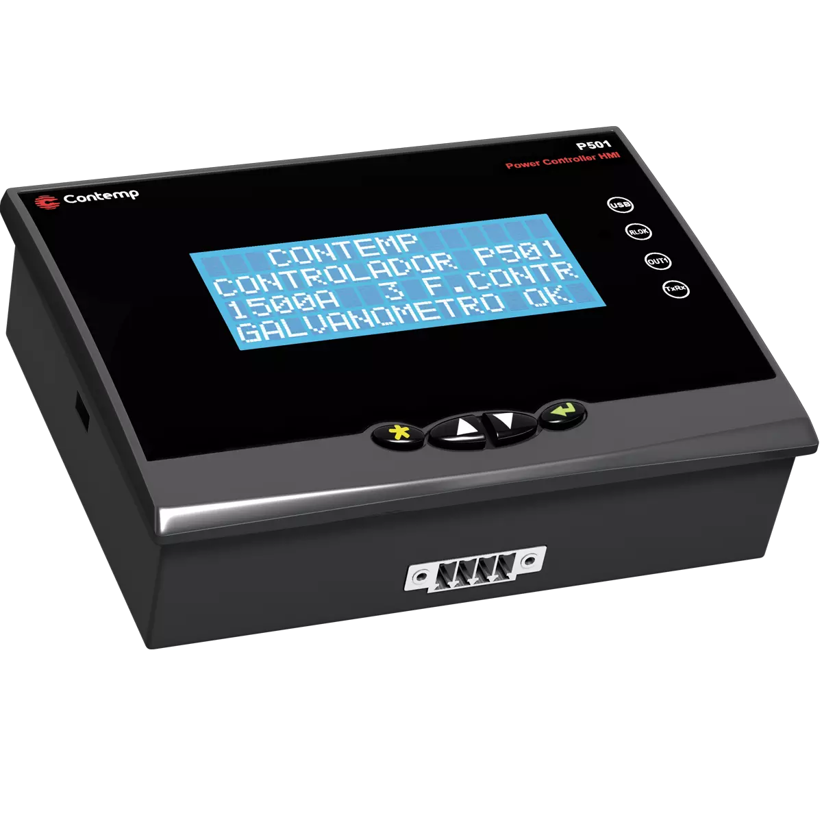 Operando como um espelho do controlador P501, a HMI externa permite a operação completa do equipamento, sendo própria para instalação na porta do painel.