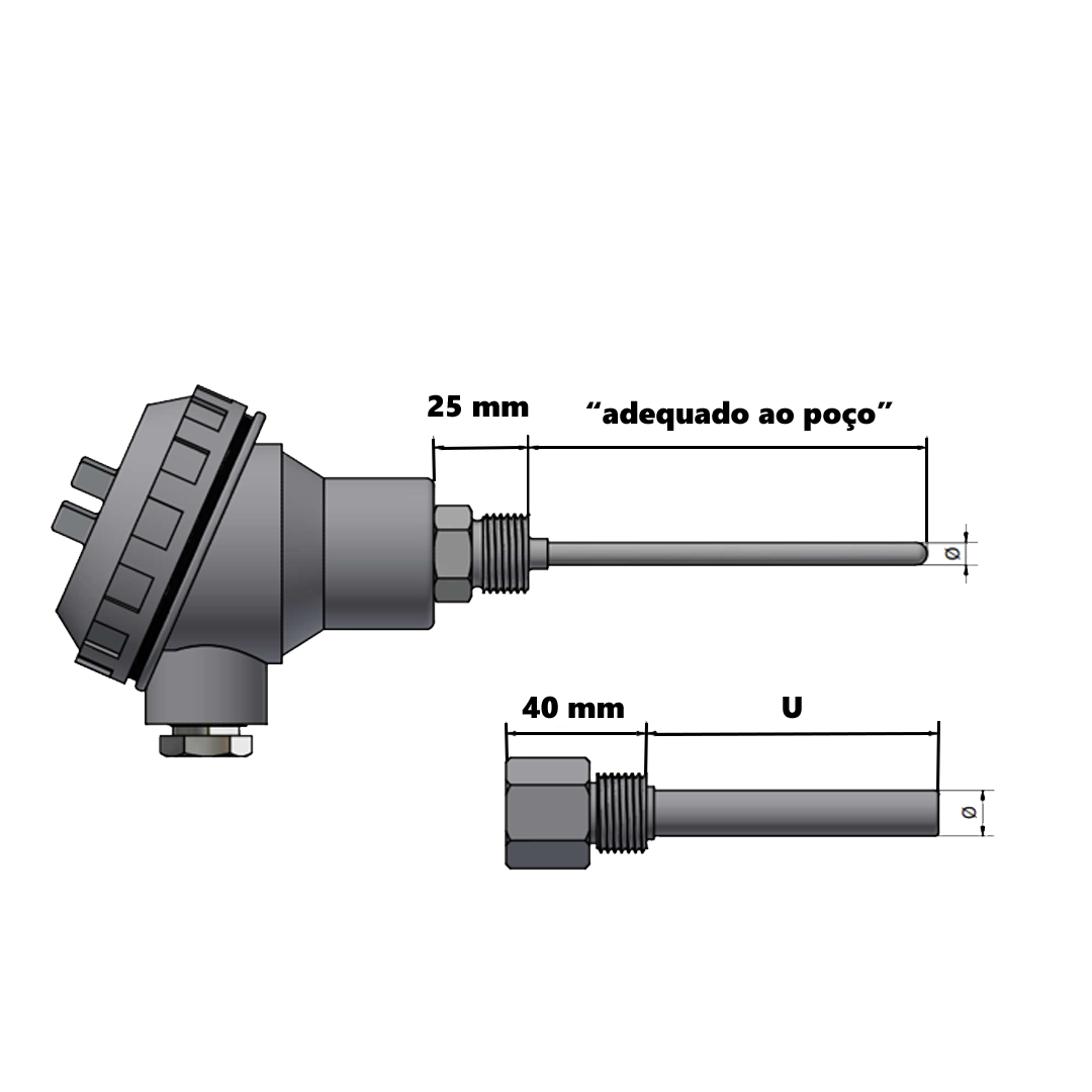 PCRR – Termoresistência com poço de proteção inox (tubo) até 1 BAR e rosca de fixação ao processo e cabeçote de ligação em alumínio ou poliamida diversos formatos. Sensor PT100 classe, A, B ou 1/10 Din, 0,003850, -70 até 420°C. Opcionais: serviço de calibração RBC e transmissor 4 a 20mA