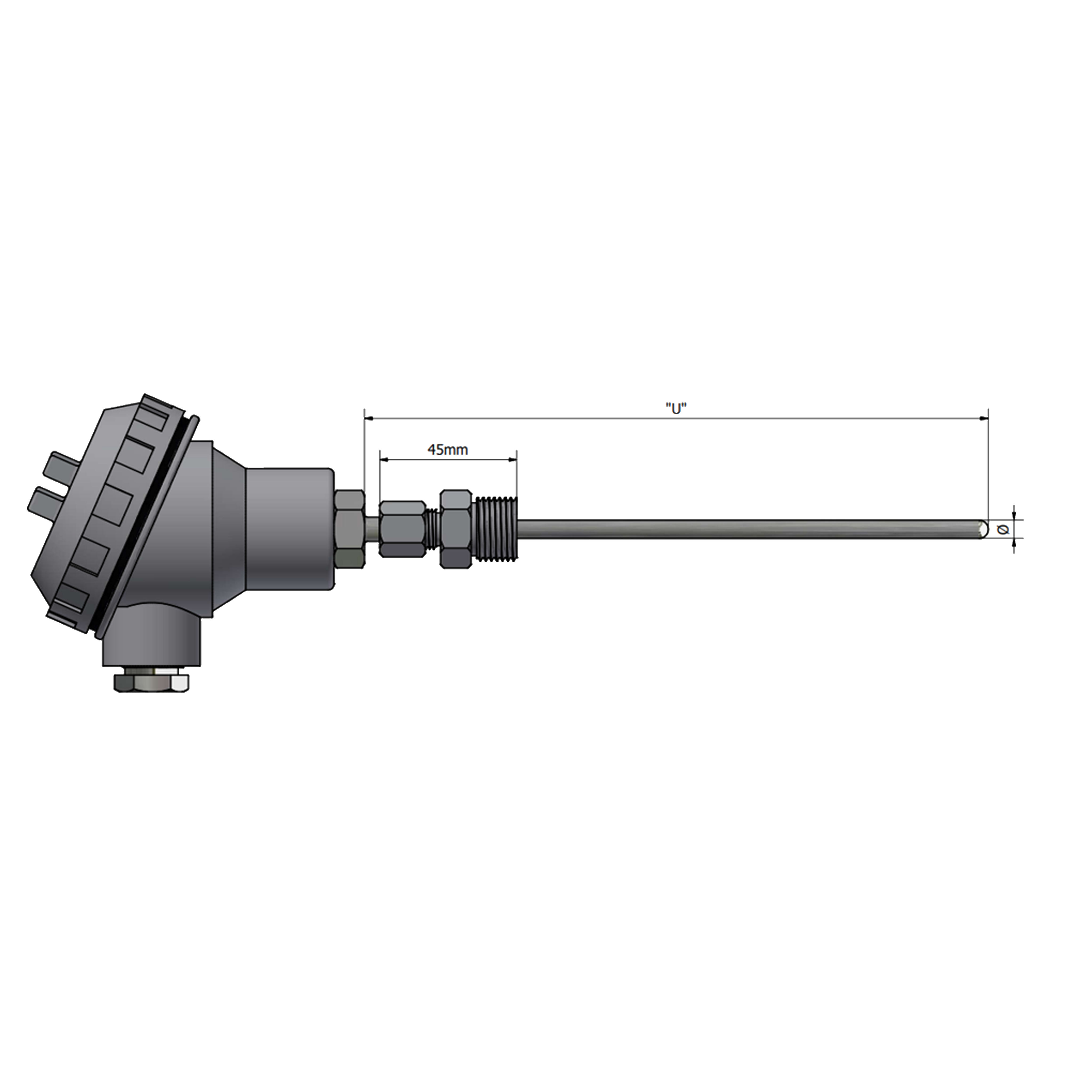 SMCL – Termoresistência com haste de proteção inox 316L no diâmetro de 3, 3,17, 4, 4,76, 6, 8mm, bucin de fixação e ajuste ao processo e cabeçote de ligação em alumínio ou poliamida. Sensor PT100, classe A, B ou 1/10 Din, 0,003850, -70 até 420°C. Opcionais: serviço de calibração RBC e transmissor 4 a 20mA