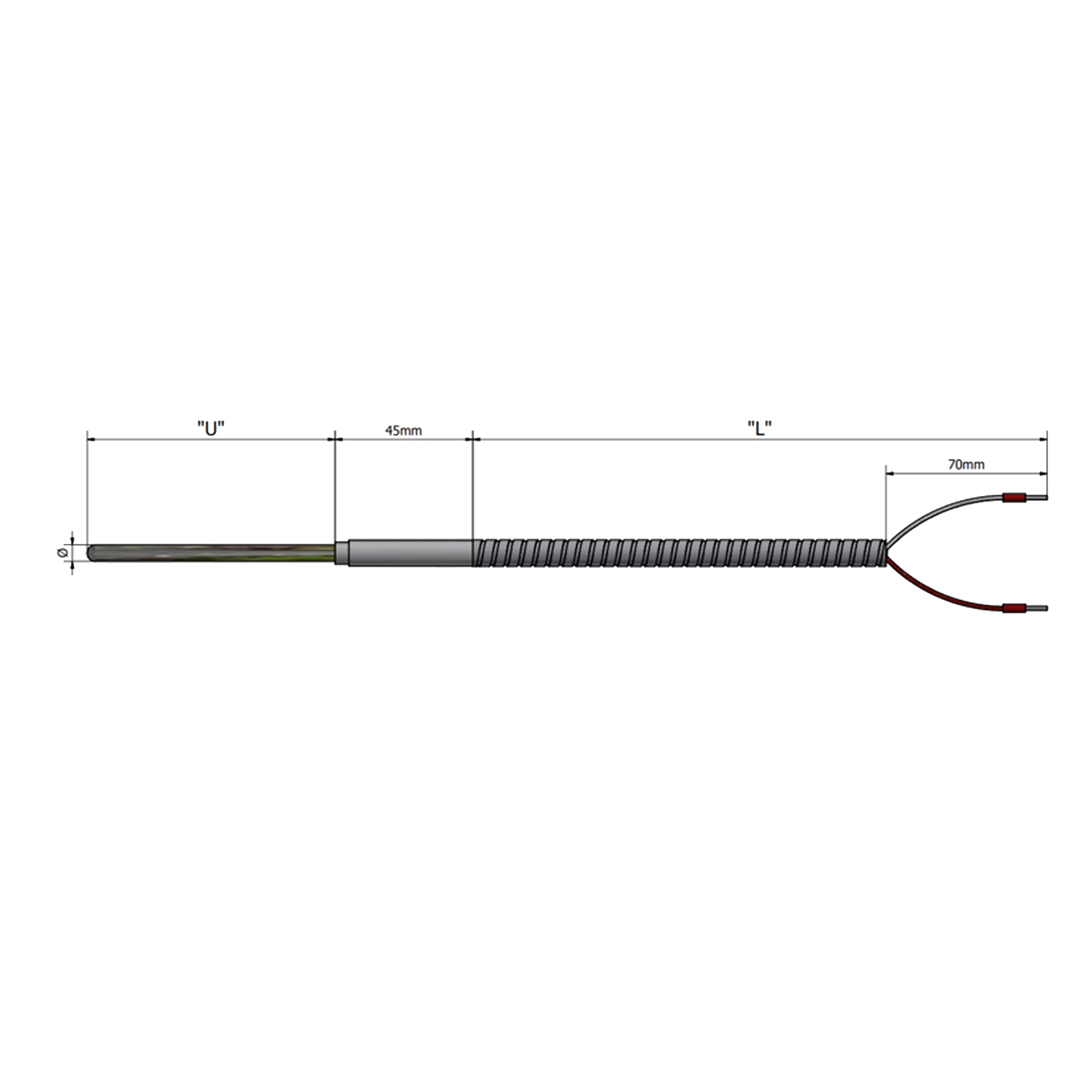 SMPT – Termopar com haste em Inox 304, 316, 310, Inconel ou Nicrobell no diâmetro de 1, 1,5, 3, 4,5, ou 6mm, isolação mineral, sapa flexível em inox, cabo compensado de sinal e selado (180°C), sensor T, J, K ou N, calibração standard ou especial, -160 até 1.150°C. Opcional: serviço de calibração RBC
