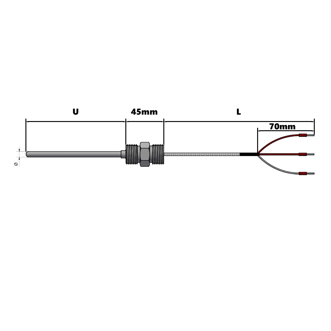 SMRD - Termoresistência com haste inox 316L, diâmetro de 3, 3,17, 4, 4,76, 6, 8mm, cabo de sinal e rosca dupla para fixação ao processo e instrumento. Sensor PT100, classe A, B ou 1/10 Din, 0,003850, -70 até 420°C. Opcional: serviço de calibração RBC