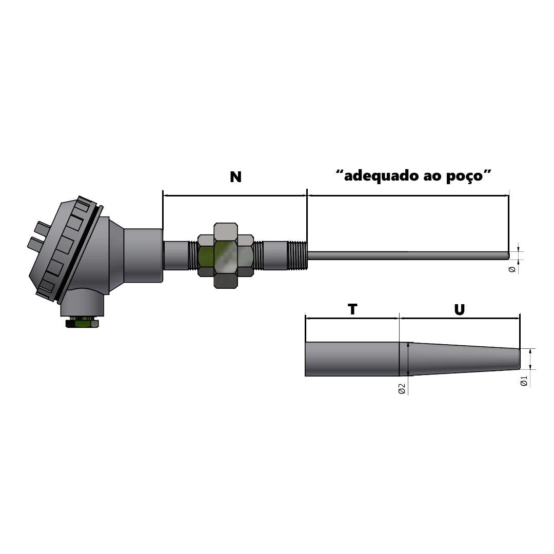 SPSD – Termoresistência com poço de proteção em inox usinado para fixação ao processo por solda, niple união inox para montagem e desmontagem rápida e cabeçote de ligação em alumínio ou poliamida diversos formatos. Sensor PT100 classe, A, B ou 1/10 Din, 0,003850, -70 até 420°C. Opcionais: serviço de calibração RBC e transmissor 4 a 20mA