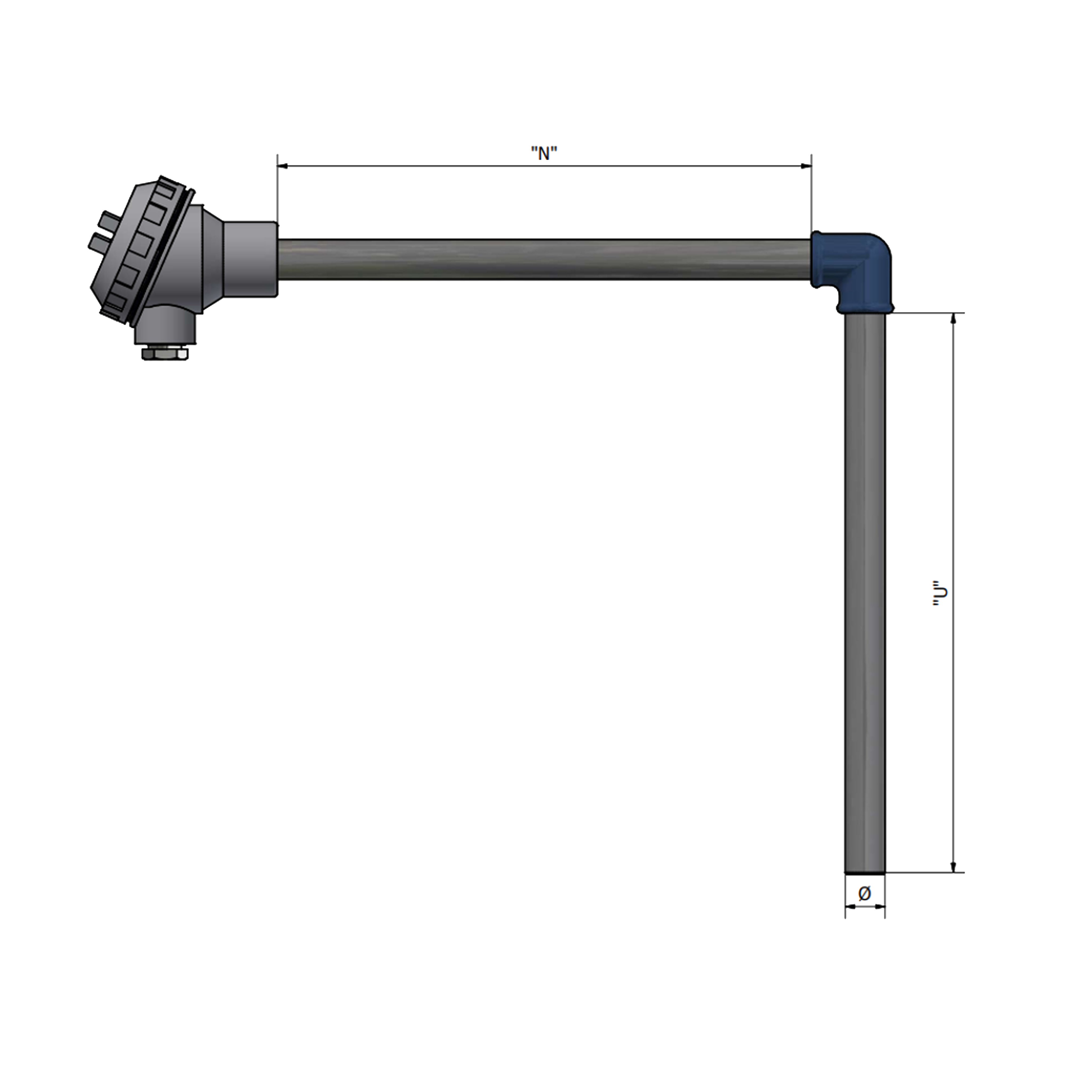 TAML – Termopar angular dedicado a imersão em banhos de tratamento térmico com área de imersão protegida por tubo de diferentes ligas metálicas no diâmetro de 21,3mm e cabeçote de ligação em alumínio diversos formatos. Sensor J, K ou N, calibração standard ou especial, -50 a 1.000°C. Opcionais: serviço de calibração RBC e transmissor 4 a 20mA