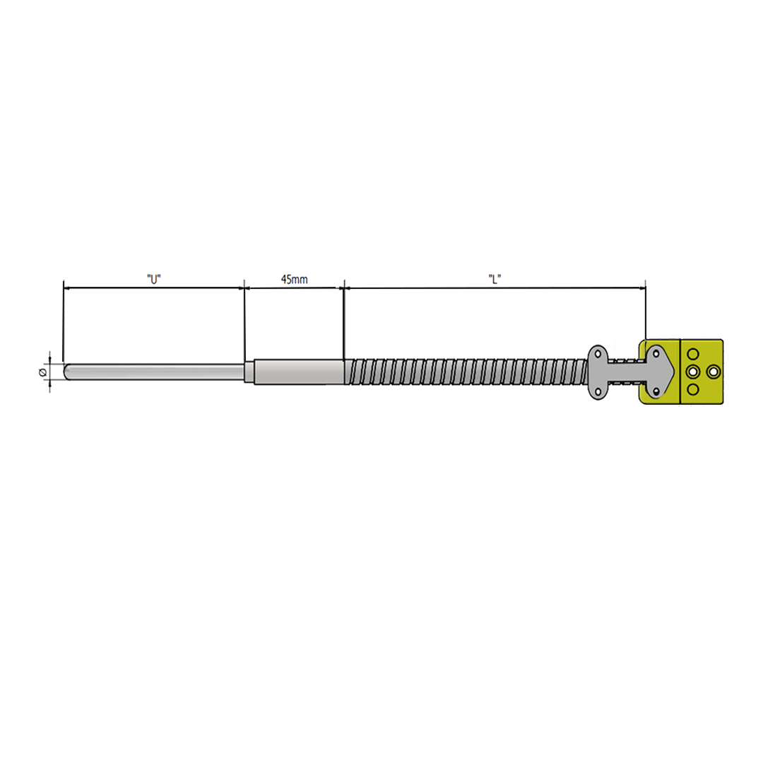 TMTM – Termopar com haste em Inox 304, 316L, 310, Inconel ou Nicrobell no diâmetro 1, 1,5, 3, 4,5, ou 6mm, pote selado (180°C), sapa flexível em inox para proteção e conector compensado. Sensor T, J, K ou N, calibração standard ou especial, -160 até 1.150°C. Opcional: serviço de calibração RBC